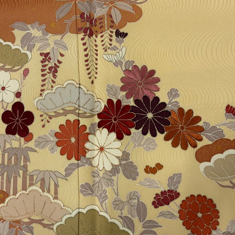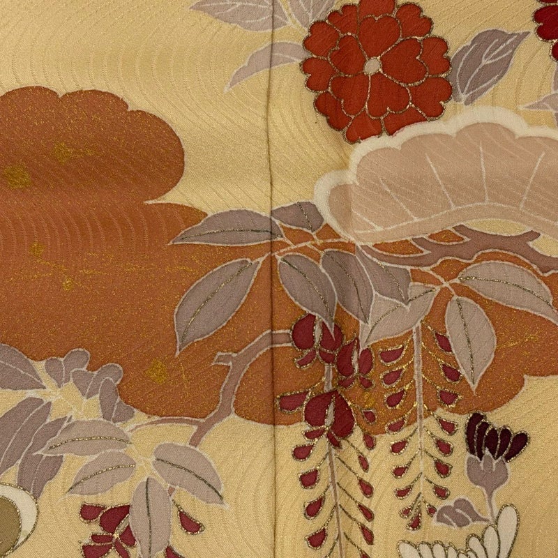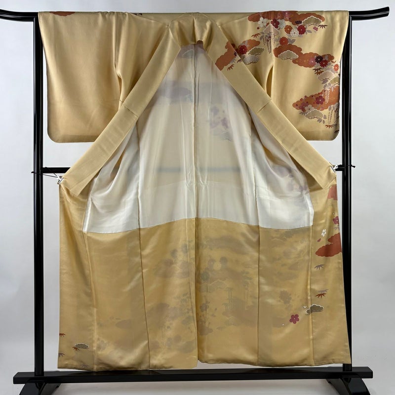 【着物ランク】秀品 【素材】正絹 【身丈】約157cm 【裄丈】約66.5cm 【袖丈】約56.5cm 【袖幅】約33.5cm 【前幅】約24.5cm 【後幅】約29.5cm 【サイズ】M 【着物仕立て】袷 【着用時期】10~5月 【状態ランク】ランクB 【着物着用シーン】披露宴、パーティー、お見合い、式典、茶会