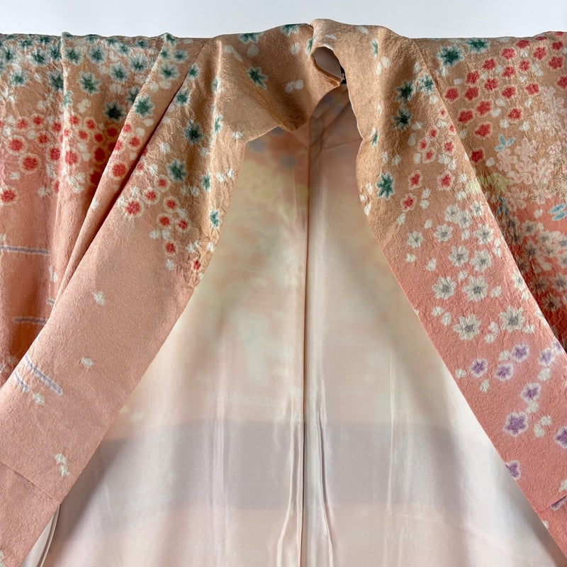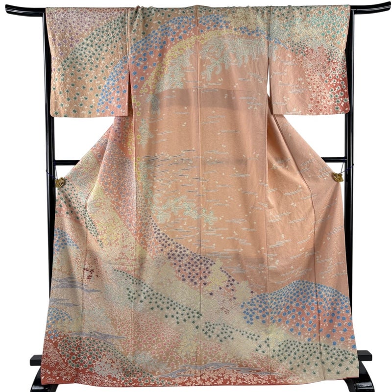 【着物ランク】逸品 【素材】正絹 【身丈】約169.5cm 【裄丈】約68cm 【袖丈】約48.5cm 【袖幅】約34.5cm 【前幅】約25cm 【後幅】約31.5cm 【サイズ】L 【着物仕立て】袷 【着用時期】10~5月 【状態ランク】ランクA 【着物着用シーン】披露宴、パーティー、お見合い、式典、茶会