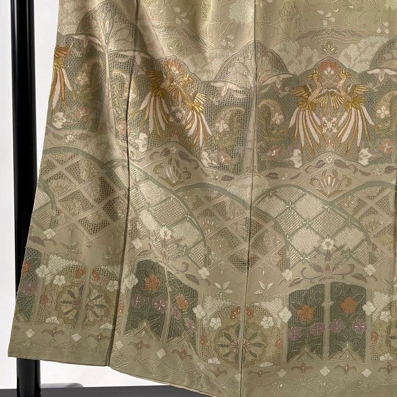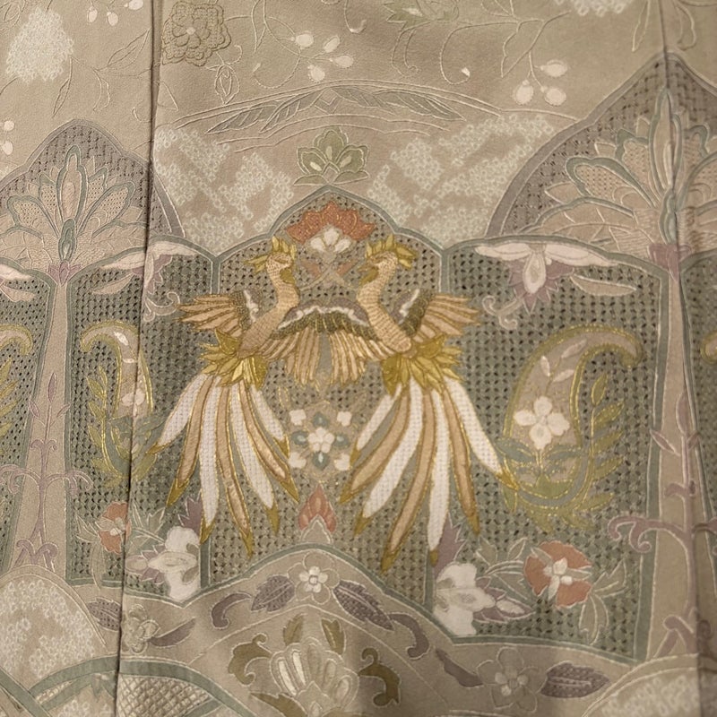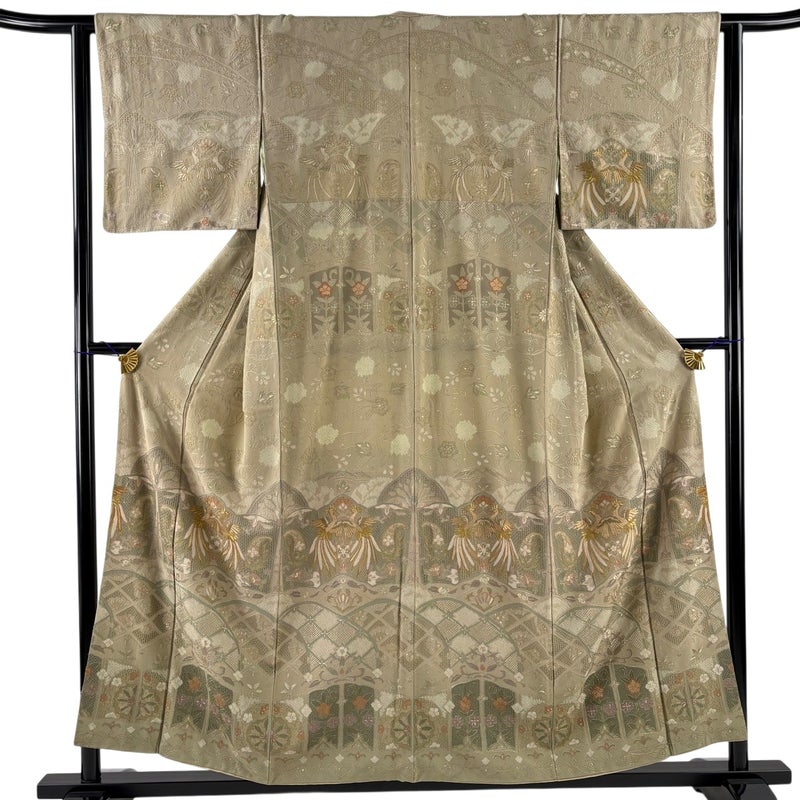 【着物ランク】逸品 【素材】正絹 【身丈】約155.5cm 【裄丈】約62cm 【袖丈】約44.5cm 【袖幅】約32.5cm 【前幅】約25cm 【後幅】約29.5cm 【サイズ】S 【着物仕立て】袷 【着用時期】10~5月 【状態ランク】ランクB 【着物着用シーン】披露宴、パーティー、お見合い、式典、茶会