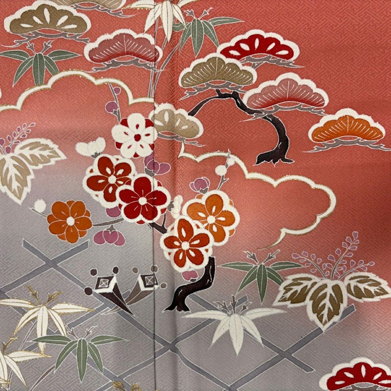 【訪問着】 赤系 サーモンピンク 秀品 B 約160cm~約169cm 裄丈66cm (M)size 袖丈50cm-60cm 7990-9980 二万以下