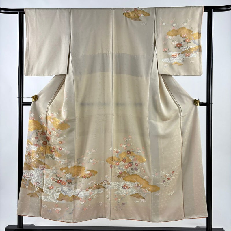 帯次第で幅広くお使いいただける素敵な訪問着です。 帯により格式を変える事の出来る印象のお着物は、様々に場面で活躍してくれることでしょう。 ※身丈・裄丈の縫込みの長さは測っておりません。 表地所々にヤケ、上前所々と右後袖にシミ、左衿に点シミ、衿周りや両袖口中に薄汚れ、表地所々にシワ、表地所々に金彩の変色がございます。 八掛所々にシミがございます。 ご購入の際はその点ご留意ください。 ※なお、厳しく商品の状態確認を行っておりますが、記載の汚れ以外にも見落とし箇所がある可能性がある旨ご了承いただけますと幸いです。 沢山の商品の中からご覧いただき誠にありがとうございます。