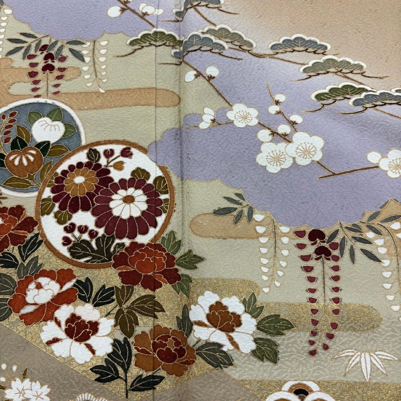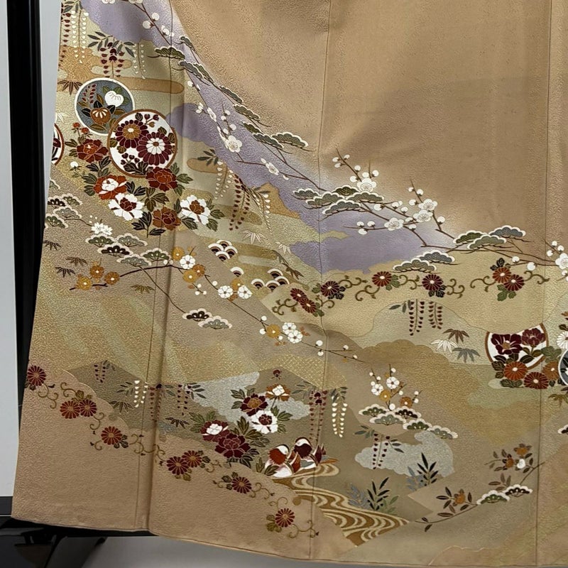 【着物ランク】秀品 【素材】正絹 【身丈】約164cm 【裄丈】約64.5cm 【袖丈】約51cm 【袖幅】約35cm 【前幅】約23cm 【後幅】約28.5cm 【サイズ】M 【着物仕立て】袷 【着用時期】10~5月 【状態ランク】ランクA 【着物着用シーン】披露宴、パーティー、お見合い、式典、茶会