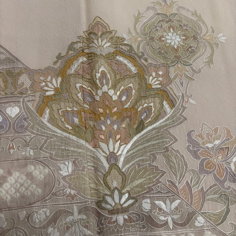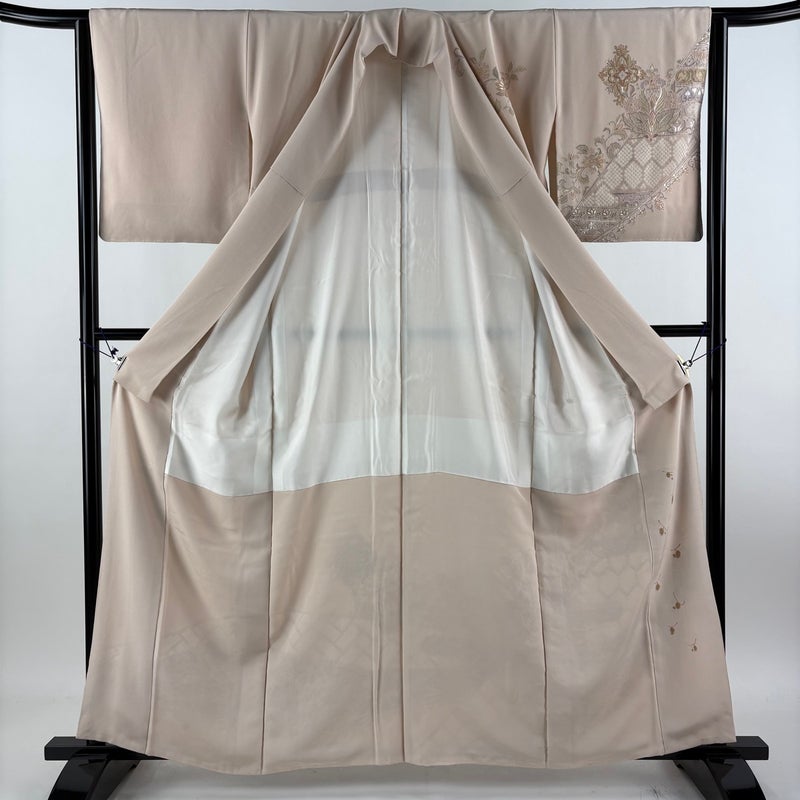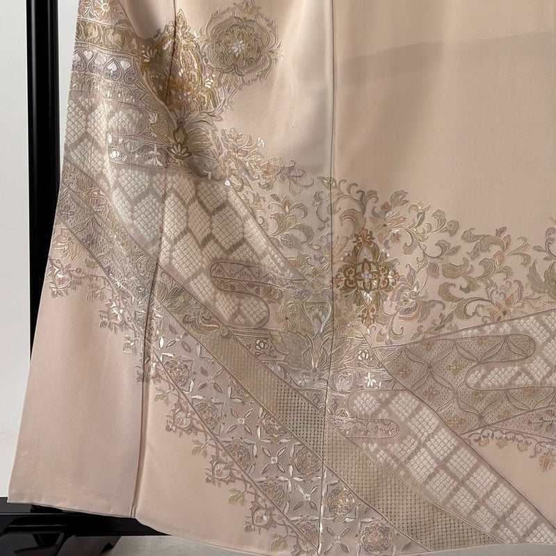 【着物ランク】名品 【素材】正絹 【身丈】約159cm 【裄丈】約63.5cm 【袖丈】約49cm 【袖幅】約32cm 【前幅】約24cm 【後幅】約30.5cm 【サイズ】S 【着物仕立て】袷 【着用時期】10~5月 【状態ランク】ランクA 【着物着用シーン】披露宴、パーティー、お見合い、式典、茶会