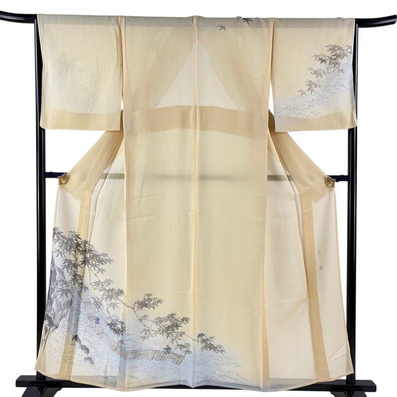 【着物ランク】秀品 【素材】正絹 【身丈】約156cm 【裄丈】約66.5cm 【袖丈】約48.5cm 【袖幅】約34cm 【前幅】約24cm 【後幅】約30cm 【サイズ】M 【着物仕立て】薄物 【着用時期】7~8月 【状態ランク】ランクC 【着物着用シーン】披露宴、パーティー、お見合い、式典、茶会