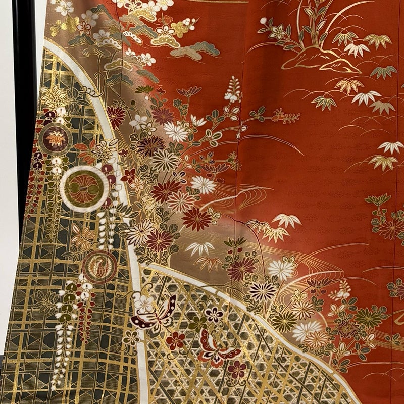【着物ランク】秀品 【素材】正絹 【身丈】約166.5cm 【裄丈】約66.5cm 【袖丈】約49.5cm 【袖幅】約34cm 【前幅】約23cm 【後幅】約30.5cm 【サイズ】M 【着物仕立て】袷 【着用時期】10~5月 【状態ランク】ランクB 【着物着用シーン】披露宴、パーティー、お見合い、式典、茶会