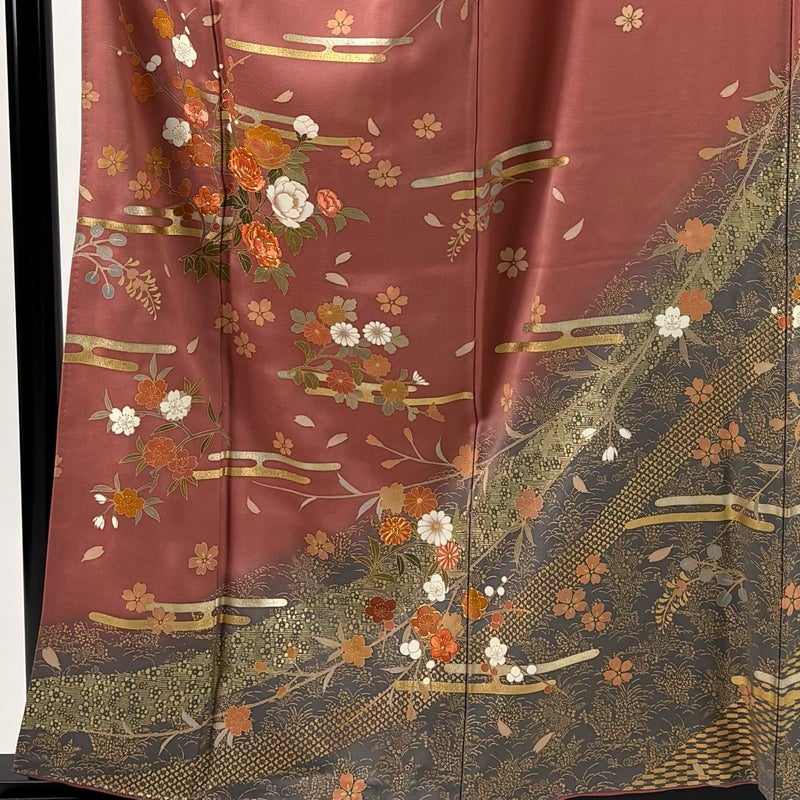 【着物ランク】秀品 【素材】正絹 【身丈】約159cm 【裄丈】約64cm 【袖丈】約48.5cm 【袖幅】約33cm 【前幅】約23.5cm 【後幅】約30.5cm 【サイズ】M 【着物仕立て】袷 【着用時期】10~5月 【状態ランク】ランクB 【着物着用シーン】披露宴、パーティー、お見合い、式典、茶会