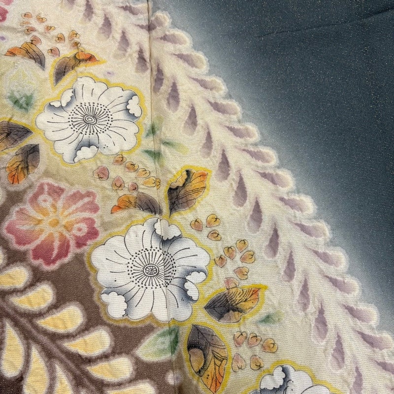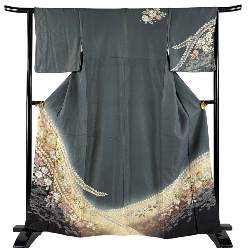 【着物ランク】秀品 【素材】正絹 【身丈】約161cm 【裄丈】約65.5cm 【袖丈】約46cm 【袖幅】約33.5cm 【前幅】約24cm 【後幅】約30cm 【サイズ】M 【着物仕立て】袷 【着用時期】10~5月 【状態ランク】ランクB 【着物着用シーン】披露宴、パーティー、お見合い、式典、茶会