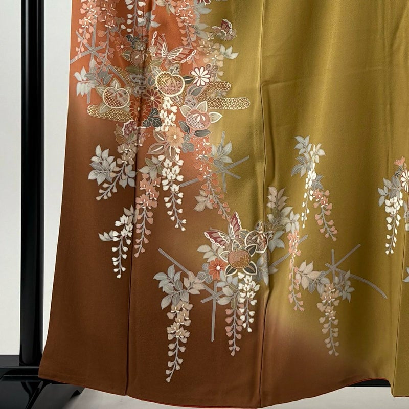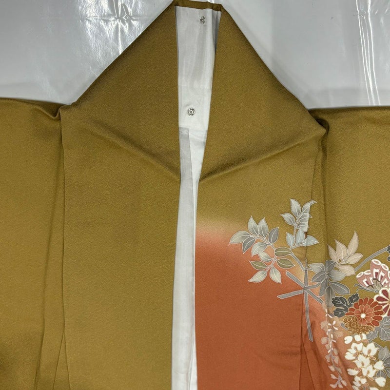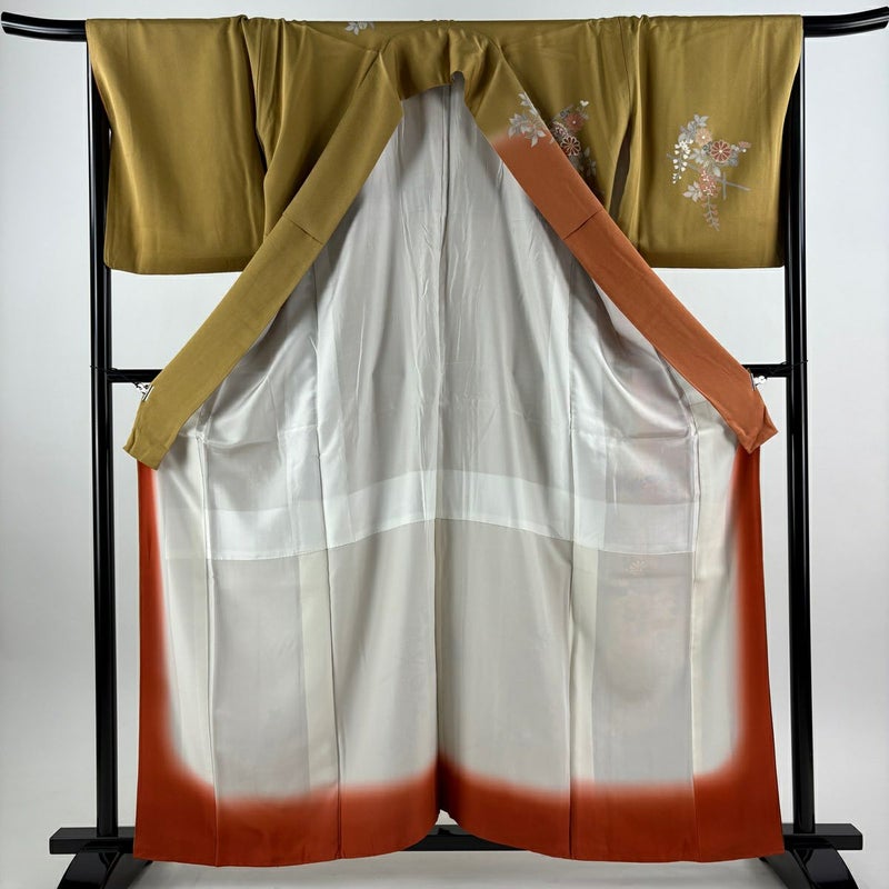 【着物ランク】秀品 【素材】正絹 【身丈】約159cm 【裄丈】約67cm 【袖丈】約48cm 【袖幅】約35cm 【前幅】約24cm 【後幅】約29.5cm 【サイズ】M 【着物仕立て】袷 【着用時期】10~5月 【状態ランク】ランクB 【着物着用シーン】披露宴、パーティー、お見合い、式典、茶会