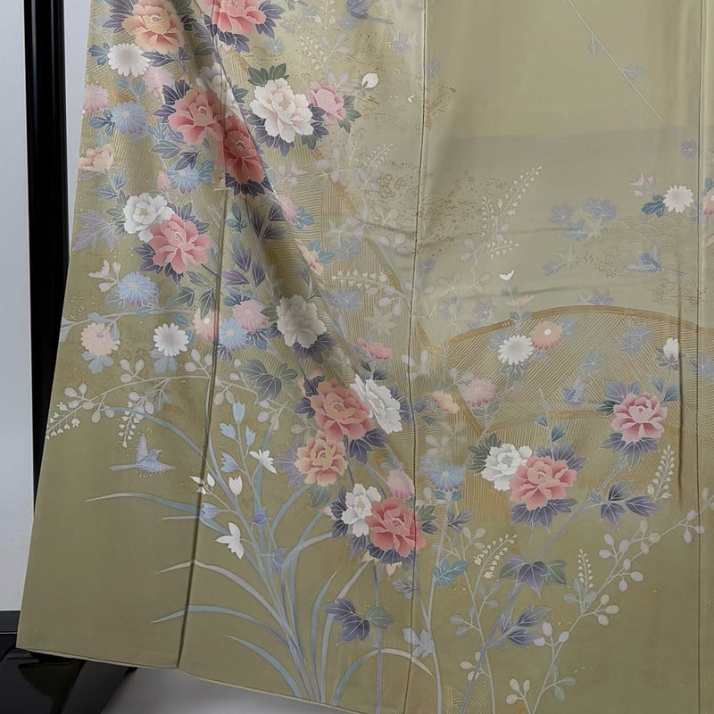 気品たっぷりにお召し頂ける素敵な訪問着です。 上品な華やぎを求められるパーティーや、品格が求められるお席などにお使い頂けます。 ※身丈・裄丈の縫込みの長さは測っておりません。 衿周りや両袖口中に汚れ、表地所々にシワ、表地所々に金彩の剥がれ、表地所々に金彩の変色がございます。 裏地所々にヤケ、裏地所々にシワがございます。 ご購入の際はその点ご留意ください。 ※なお、厳しく商品の状態確認を行っておりますが、記載の汚れ以外にも見落とし箇所がある可能性がある旨ご了承いただけますと幸いです。 沢山の商品の中からご覧いただき誠にありがとうございます。