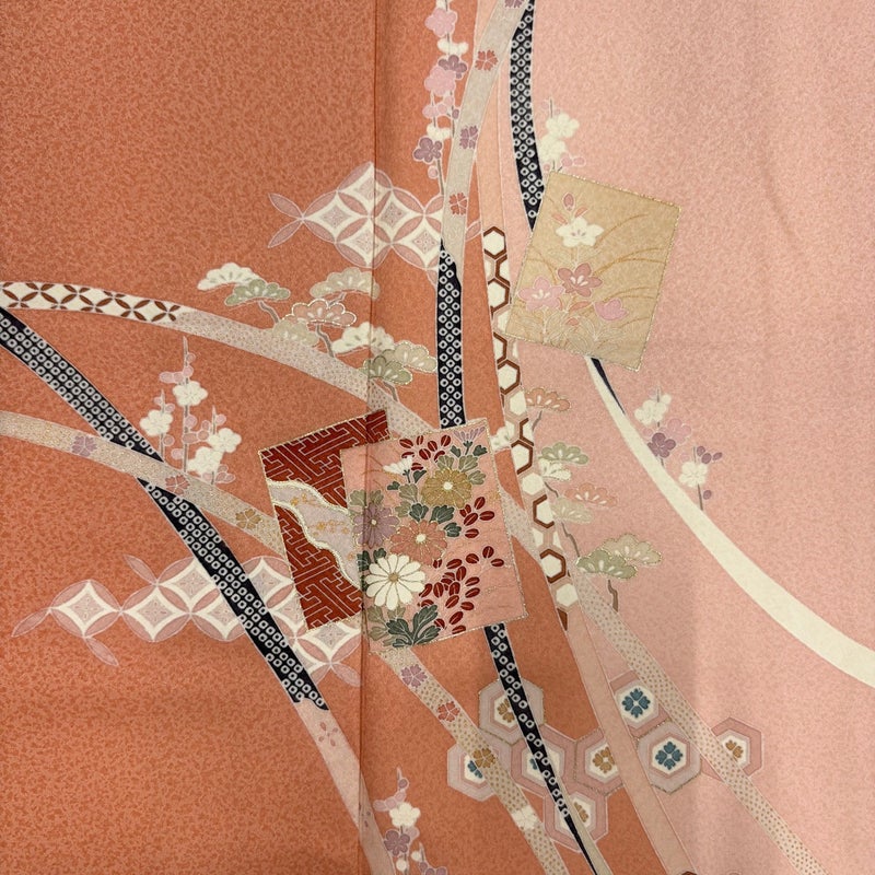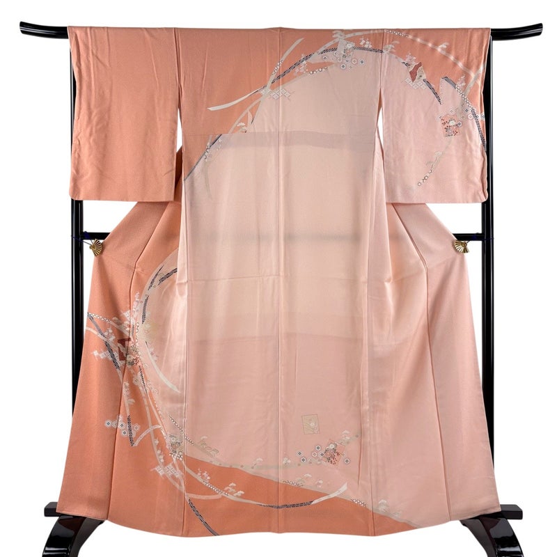 【訪問着】 赤系 サーモンピンク 秀品 B 約160cm~約169cm 裄丈66cm (M)size 袖丈50cm-60cm 7990-9980 二万以下