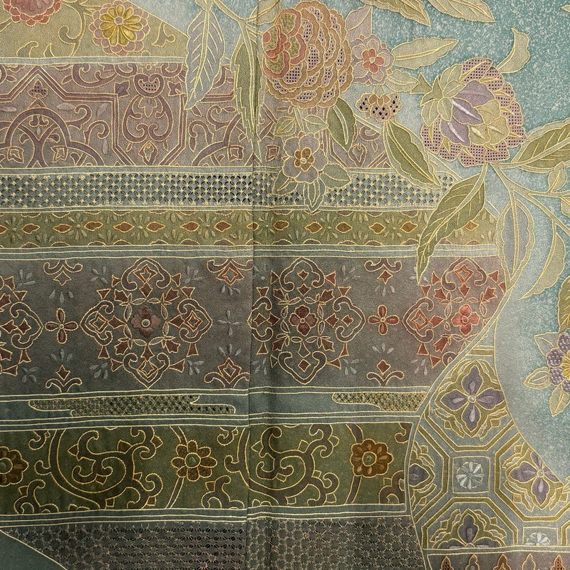 【着物ランク】秀品 【素材】正絹 【身丈】約157cm 【裄丈】約64.5cm 【袖丈】約48.5cm 【袖幅】約33.5cm 【前幅】約25.5cm 【後幅】約31cm 【サイズ】M 【着物仕立て】袷 【着用時期】10~5月 【状態ランク】ランクC 【着物着用シーン】披露宴、パーティー、お見合い、式典、茶会