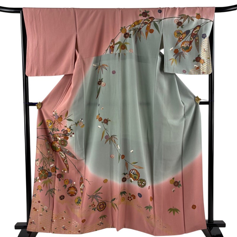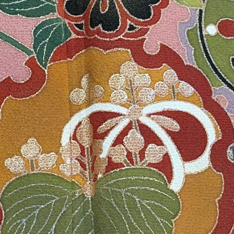【着物ランク】秀品 【素材】正絹 【身丈】約162cm 【裄丈】約66.5cm 【袖丈】約48cm 【袖幅】約35cm 【前幅】約22.5cm 【後幅】約30cm 【サイズ】M 【着物仕立て】袷 【着用時期】10~5月 【状態ランク】ランクB 【着物着用シーン】披露宴、パーティー、お見合い、式典、茶会