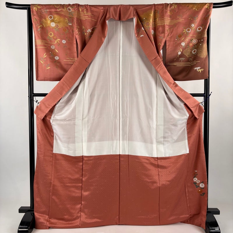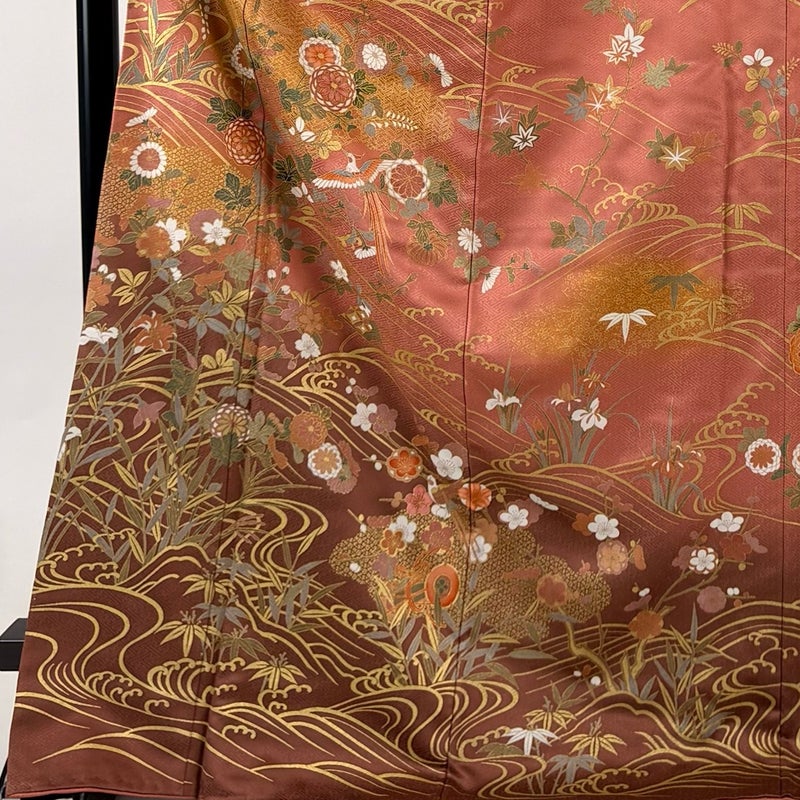【着物ランク】秀品 【素材】正絹 【身丈】約173cm 【裄丈】約67cm 【袖丈】約57.5cm 【袖幅】約34.5cm 【前幅】約24.5cm 【後幅】約30.5cm 【サイズ】M 【着物仕立て】袷 【着用時期】10~5月 【状態ランク】ランクB 【着物着用シーン】披露宴、パーティー、お見合い、式典、茶会