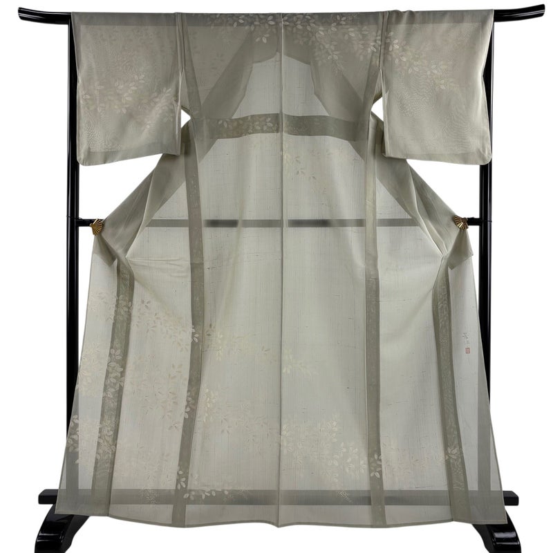 【着物ランク】秀品 【素材】正絹 【身丈】約166.5cm 【裄丈】約66.5cm 【袖丈】約51cm 【袖幅】約34cm 【前幅】約25cm 【後幅】約30.5cm 【サイズ】M 【着物仕立て】薄物 【着用時期】7~8月 【状態ランク】ランクB 【着物着用シーン】披露宴、パーティー、お見合い、式典、茶会
