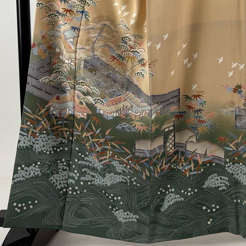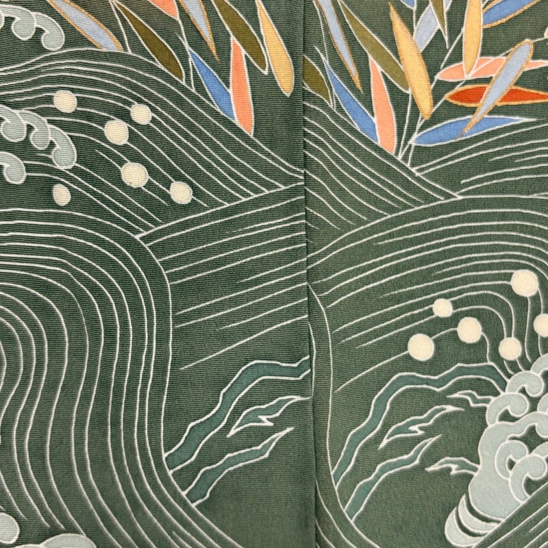 【着物ランク】秀品 【素材】正絹 【身丈】約162cm 【裄丈】約68cm 【袖丈】約49cm 【袖幅】約35cm 【前幅】約26.5cm 【後幅】約32cm 【サイズ】L 【着物仕立て】袷 【着用時期】10~5月 【状態ランク】ランクC 【着物着用シーン】披露宴、パーティー、お見合い、式典、茶会