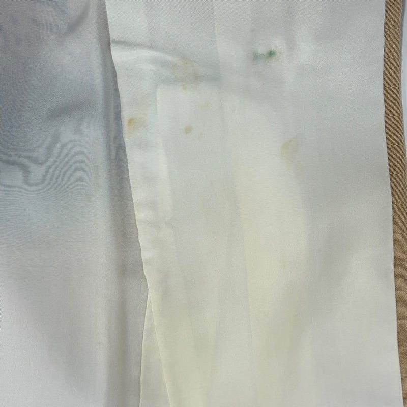 気品たっぷりにお召し頂ける素敵な訪問着です。 上品な華やぎを求められるパーティーや、品格が求められるお席などにお使い頂けます。 ※身丈・裄丈の縫込みの長さは測っておりません。一つ紋の染め抜き紋です。 上前と後身頃と右袖前後などにシミ、左衿に薄いシミ、下前に点シミ、衿周りや両袖口中に汚れ、表地所々にシワ、表地所々に金彩の変色がございます。 胴裏所々にシミ、衿裏に大きなシミ、衿裏にホックシミがございます。 また、上前から後身頃にかけて柄のズレがございます。 ご購入の際はその点ご留意ください。 ※なお、厳しく商品の状態確認を行っておりますが、記載の汚れ以外にも見落とし箇所がある可能性がある旨ご了承いただけますと幸いです。 沢山の商品の中からご覧いただき誠にありがとうございます。