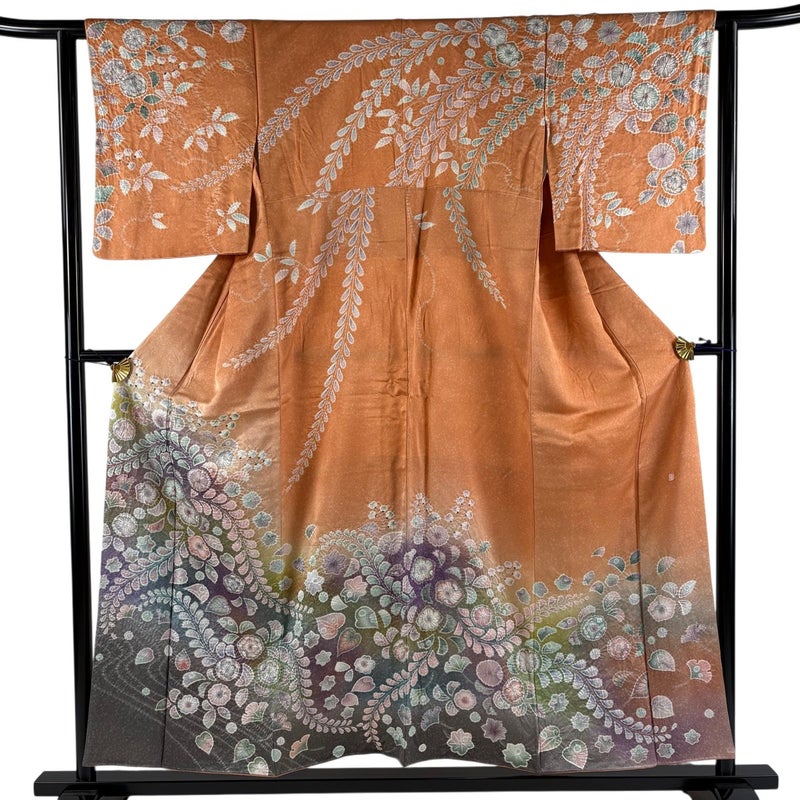 【訪問着】 赤系 オレンジ 秀品 A 約150cm~約159cm 裄丈62cm以下 (S)size 袖丈48cm 9990-29990 美品 二万以下