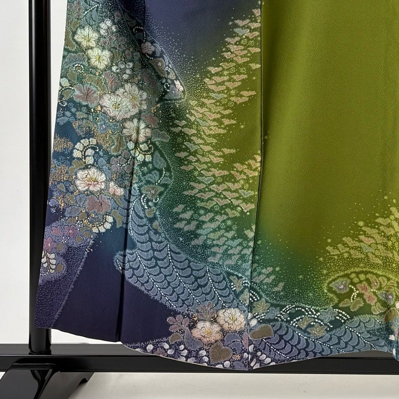 幻の染である辻ヶ花絞り染めの匠として不動の地位を確立した作家、吉乃一廉の作品です。 気品たっぷりにお召し頂ける素敵な訪問着です。 上品な華やぎを求められるパーティーや、品格が求められるお席などにお使い頂けます。 身丈を+3.0cm程、現在の長さから伸ばせます。 裄丈を+3.0cm程、現在の長さから伸ばせます。 表地所々にヤケ、右胸にシミ、衿周りや両袖口中に汚れ、後身頃と右袖前後にシワがございます。 裏地所々にヤケ、胴裏と八掛裾部分にシミ、裏地両脇に汗シミ、八掛裾部分に汚れ、胴裏背中心に縫い目のゆるみがございます。 また、上前から後身頃にかけて柄のズレがございます。 ご購入の際はその点ご留意ください。 ※なお、厳しく商品の状態確認を行っておりますが、記載の汚れ以外にも見落とし箇所がある可能性がある旨ご了承いただけますと幸いです。 沢山の商品の中からご覧いただき誠にありがとうございます。