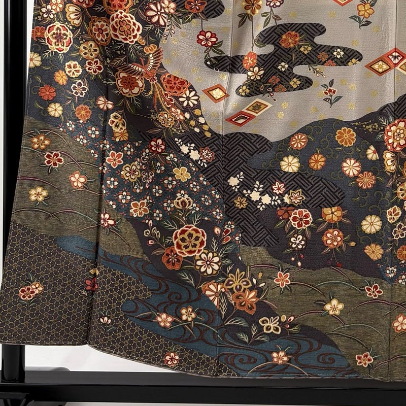 【着物ランク】優品 【素材】正絹 【身丈】約156cm 【裄丈】約64cm 【袖丈】約55cm 【袖幅】約32.5cm 【前幅】約23.5cm 【後幅】約30cm 【サイズ】M 【着物仕立て】袷 【着用時期】10~5月 【状態ランク】ランクB 【着物着用シーン】披露宴、パーティー、お見合い、式典、茶会