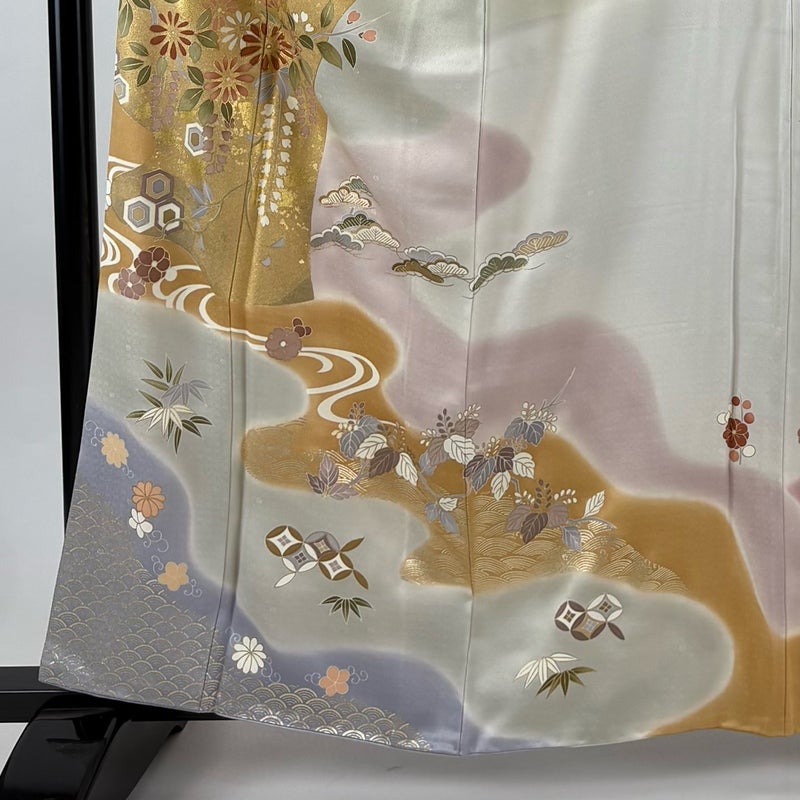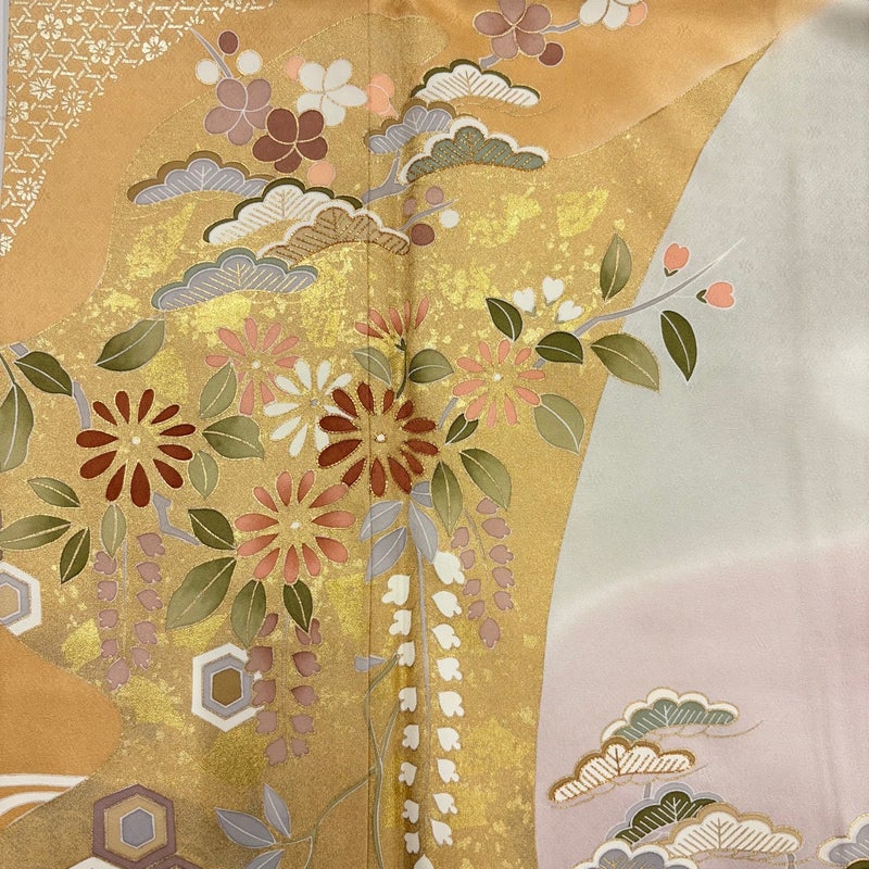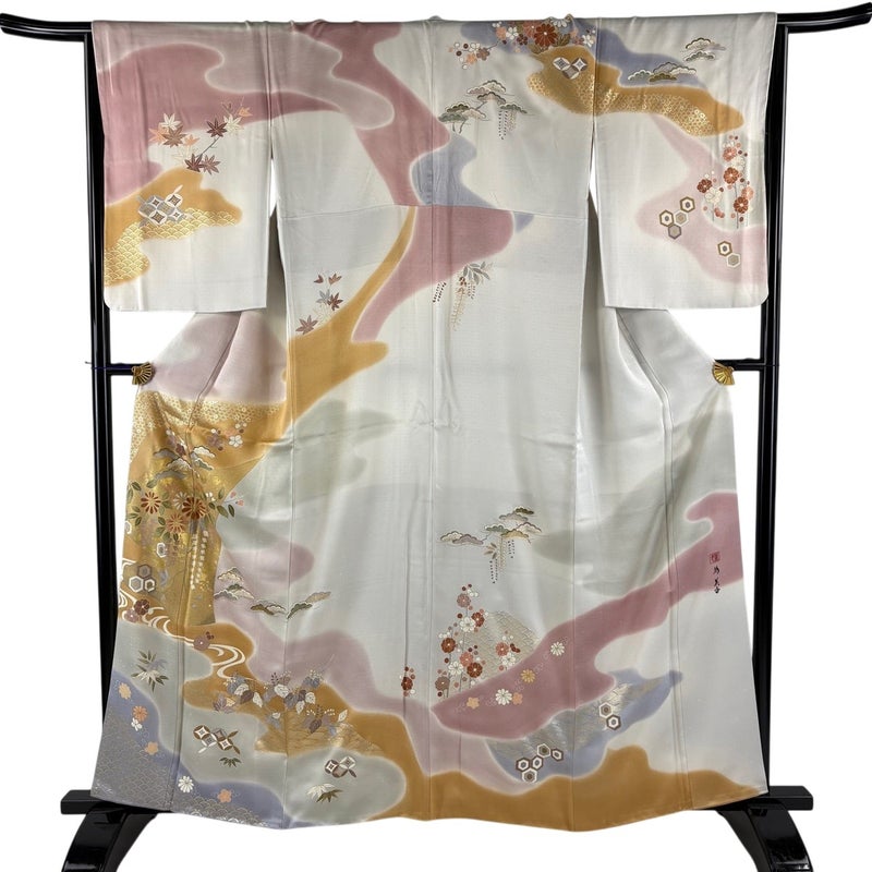 【着物ランク】秀品 【素材】正絹 【身丈】約160cm 【裄丈】約66cm 【袖丈】約56.5cm 【袖幅】約33cm 【前幅】約24cm 【後幅】約30cm 【サイズ】M 【着物仕立て】袷 【着用時期】10~5月 【状態ランク】ランクB 【着物着用シーン】披露宴、パーティー、お見合い、式典、茶会