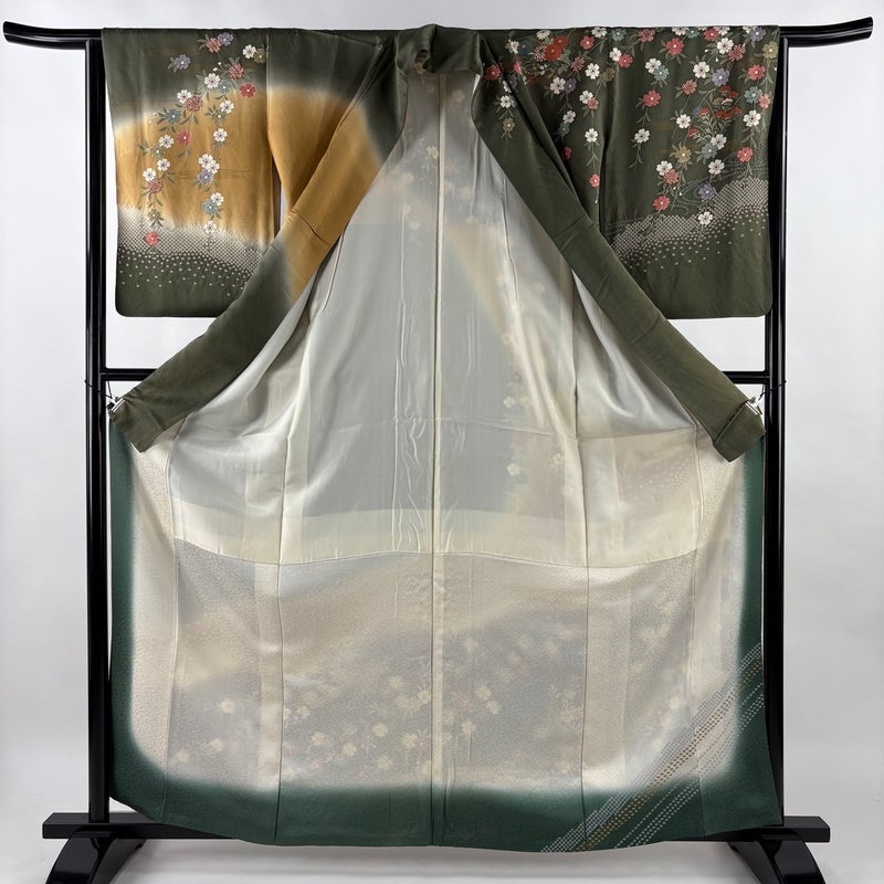 【訪問着】 茶系 茶緑色 秀品 B 約160cm~約169cm 裄丈65cm (M)size 袖丈50cm-60cm 7990-9980 二万以下