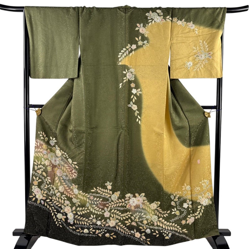 【訪問着】 茶系 茶緑色 名品 A 約160cm~約169cm 裄丈67cm-68cm (L)size 袖丈49cm 9990-29990 美品 二万以下