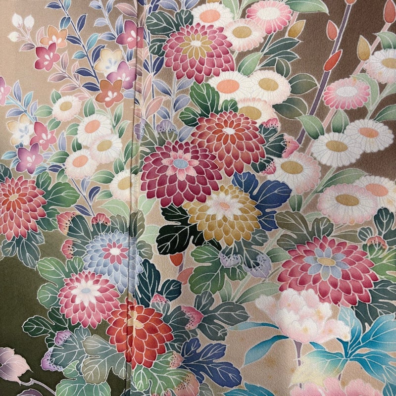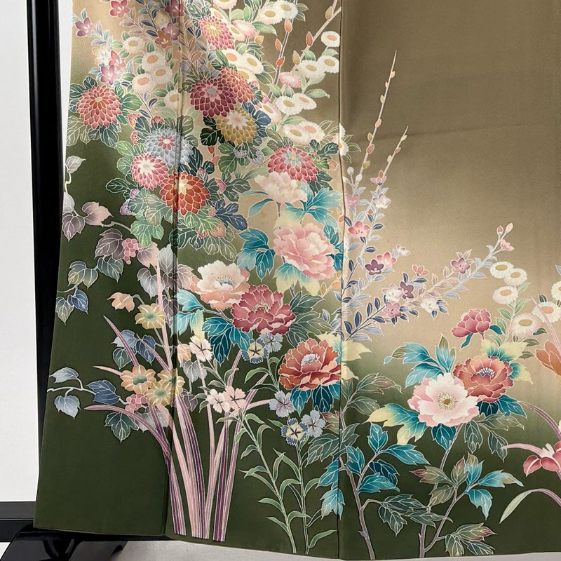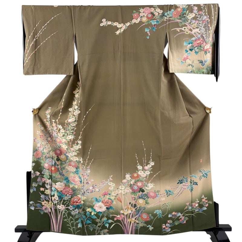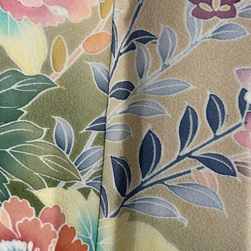 【着物ランク】名品 【素材】正絹 【身丈】約161.5cm 【裄丈】約66cm 【袖丈】約48cm 【袖幅】約32cm 【前幅】約22cm 【後幅】約28cm 【サイズ】M 【着物仕立て】袷 【着用時期】10~5月 【状態ランク】ランクC 【着物着用シーン】披露宴、パーティー、お見合い、式典、茶会