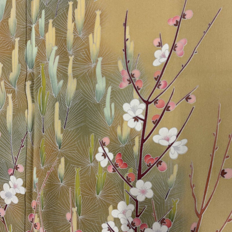 【着物ランク】名品 【素材】正絹 【身丈】約163cm 【裄丈】約67cm 【袖丈】約52cm 【袖幅】約34cm 【前幅】約23cm 【後幅】約29.5cm 【サイズ】M 【着物仕立て】袷 【着用時期】10~5月 【状態ランク】ランクB 【着物着用シーン】披露宴、パーティー、お見合い、式典、茶会