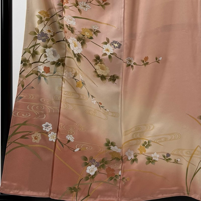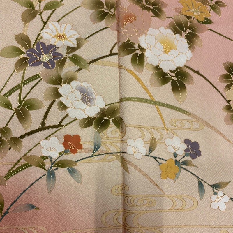 【着物ランク】秀品 【素材】正絹 【身丈】約158.5cm 【裄丈】約64cm 【袖丈】約48cm 【袖幅】約32.5cm 【前幅】約24cm 【後幅】約29.5cm 【サイズ】M 【着物仕立て】袷 【着用時期】10~5月 【状態ランク】ランクA 【着物着用シーン】披露宴、パーティー、お見合い、式典、茶会