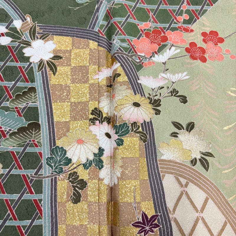 【着物ランク】秀品 【素材】正絹 【身丈】約162.5cm 【裄丈】約67cm 【袖丈】約49cm 【袖幅】約34.5cm 【前幅】約24.5cm 【後幅】約30.5cm 【サイズ】M 【着物仕立て】袷 【着用時期】10~5月 【状態ランク】ランクB 【着物着用シーン】披露宴、パーティー、お見合い、式典、茶会