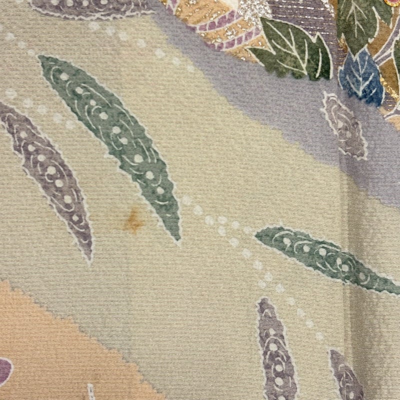 帯次第で幅広くお使いいただける素敵な訪問着です。 帯により格式を変える事の出来る印象のお着物は、様々に場面で活躍してくれることでしょう。 ※身丈・裄丈の縫込みの長さは測っておりません。 上前と左胸にシミ、左後袖に大きなシミ、衿周りや両袖口中に汚れ、表地所々にシワ、表地所々に金銀彩の剥がれ、表地所々に金銀彩の変色がございます。 裏地所々にシワ、胴裏背中心に縫い目のゆるみがございます。 ご購入の際はその点ご留意ください。 ※なお、厳しく商品の状態確認を行っておりますが、記載の汚れ以外にも見落とし箇所がある可能性がある旨ご了承いただけますと幸いです。 沢山の商品の中からご覧いただき誠にありがとうございます。