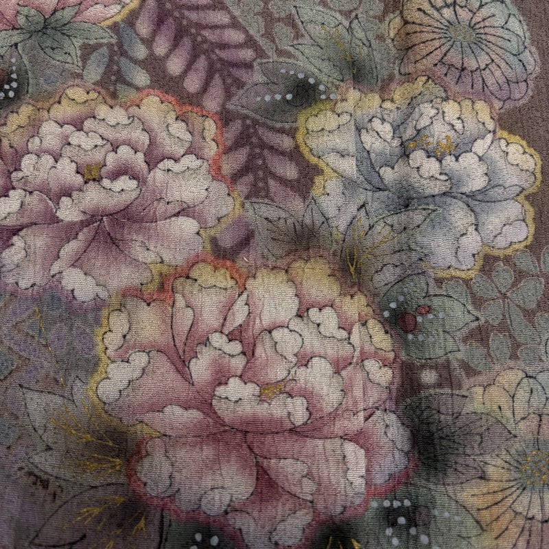【着物ランク】秀品 【素材】正絹 【身丈】約164cm 【裄丈】約67.5cm 【袖丈】約64.5cm 【袖幅】約34.5cm 【前幅】約24cm 【後幅】約31cm 【サイズ】L 【着物仕立て】袷 【着用時期】10~5月 【状態ランク】ランクA 【着物着用シーン】披露宴、パーティー、お見合い、式典、茶会
