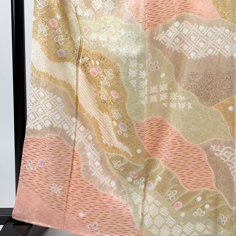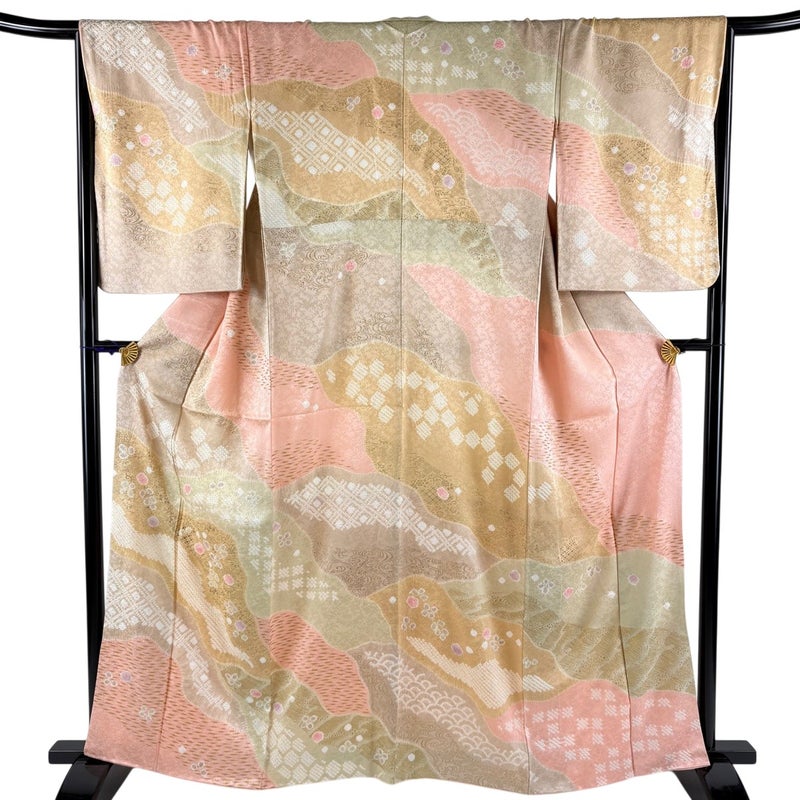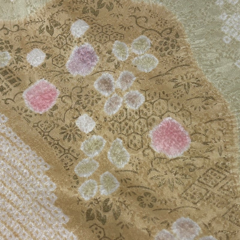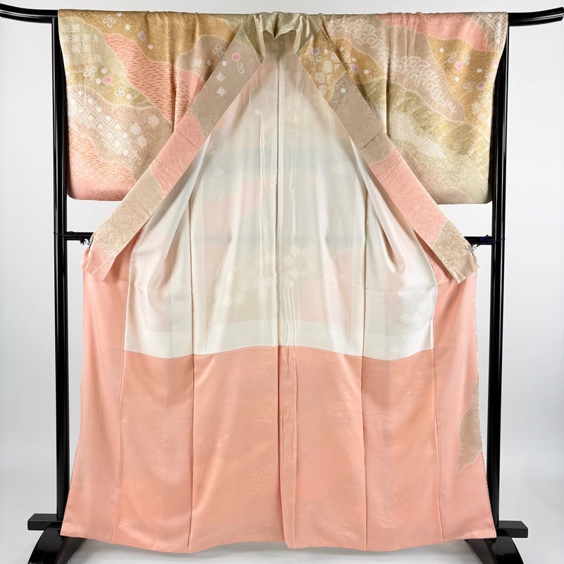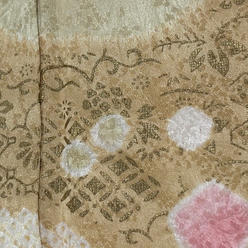 【着物ランク】秀品 【素材】正絹 【身丈】約162.5cm 【裄丈】約67cm 【袖丈】約56cm 【袖幅】約35cm 【前幅】約24cm 【後幅】約30cm 【サイズ】M 【着物仕立て】袷 【着用時期】10~5月 【状態ランク】ランクB 【着物着用シーン】披露宴、パーティー、お見合い、式典、茶会