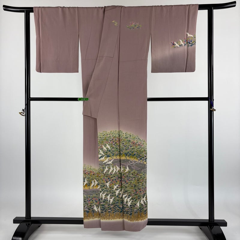気品たっぷりにお召し頂ける素敵な訪問着です。 上品な華やぎを求められるパーティーや、品格が求められるお席などにお使い頂けます。 身丈を+5.5cm程、現在の長さから伸ばせます。 裄丈を+3.5cm程、現在の長さから伸ばせます。 表地所々にヤケ、両袖前後にシミ、衿周りや両袖口中に汚れ、表地所々にシワがございます。 裏地所々にヤケ、八掛に薄いシミがございます。 また、上前から後身頃にかけて柄のズレがございます。 リユース品としては良い状態で、まだまだご活用頂けると思われます。 ※なお、厳しく商品の状態確認を行っておりますが、記載の汚れ以外にも見落とし箇所がある可能性がある旨ご了承いただけますと幸いです。 沢山の商品の中からご覧いただき誠にありがとうございます。