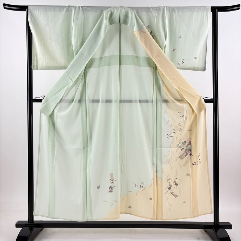 【着物ランク】優品 【素材】正絹 【身丈】約152cm 【裄丈】約64cm 【袖丈】約46.5cm 【袖幅】約32.5cm 【前幅】約25.5cm 【後幅】約30.5cm 【サイズ】M 【着物仕立て】薄物 【着用時期】7~8月 【状態ランク】ランクB 【着物着用シーン】披露宴、パーティー、お見合い、式典、茶会