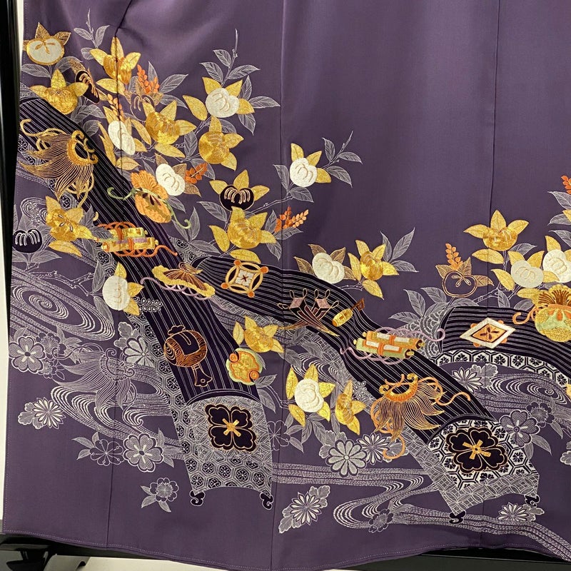 【着物ランク】逸品 【素材】正絹 【身丈】約158cm 【裄丈】約63cm 【袖丈】約48cm 【袖幅】約32cm 【前幅】約24.5cm 【後幅】約30cm 【サイズ】S 【着物仕立て】袷 【着用時期】10~5月 【状態ランク】ランクC 【作家名】千總 【着物着用シーン】披露宴出席、式典、パーティー、格式ある茶会
