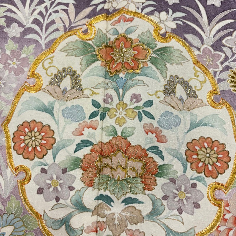 【着物ランク】秀品 【素材】正絹 【身丈】約165cm 【裄丈】約66cm 【袖丈】約50cm 【袖幅】約34cm 【前幅】約25cm 【後幅】約30cm 【サイズ】M 【着物仕立て】袷 【着用時期】10~5月 【状態ランク】ランクB 【着物着用シーン】披露宴出席、式典、パーティー、格式ある茶会