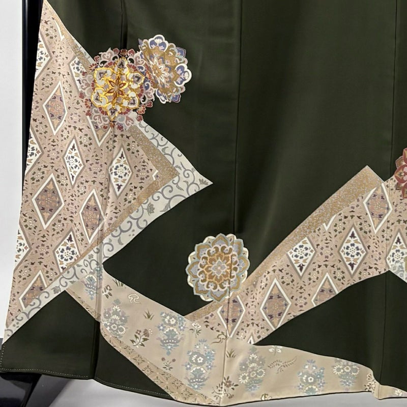 【色留袖】 茶系 茶緑色 秀品 C 約160cm~約169cm 裄丈66cm (M)size 袖丈48cm 4000-7980 二万以下