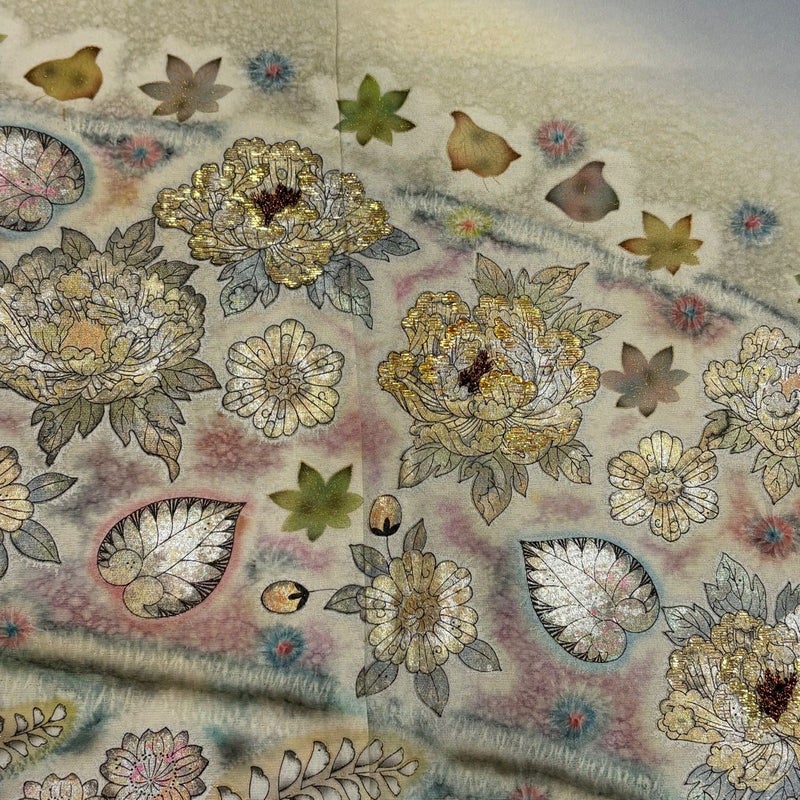 【着物ランク】秀品 【素材】正絹 【身丈】約156.5cm 【裄丈】約65cm 【袖丈】約48.5cm 【袖幅】約33.5cm 【前幅】約26cm 【後幅】約30.5cm 【サイズ】M 【着物仕立て】袷 【着用時期】10~5月 【状態ランク】ランクC 【着物着用シーン】披露宴出席、式典、パーティー、格式ある茶会