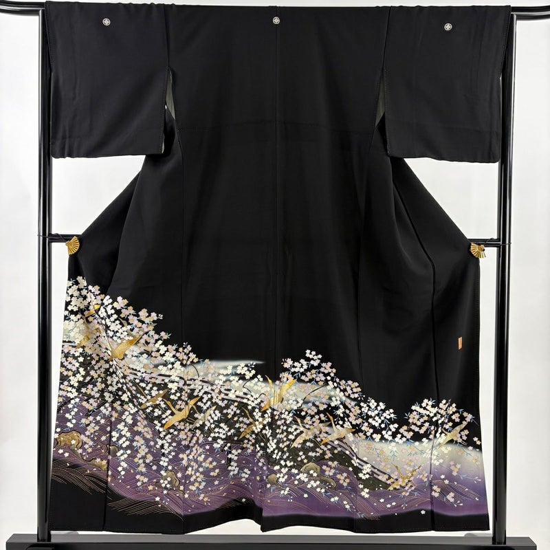 結婚式や披露宴などで親族の第一礼装として用いられる黒留袖でございます。 既婚女性が着用する着物で、最も格の高い礼装でございます。 ※身丈・裄丈の縫込みの長さは測っておりません。 表地所々にヤケ、衿周りや両袖口中に薄汚れ、表地所々に金彩の変色がございます。 リユース品としては良い状態で、まだまだご活用頂けると思われます。 ※なお、厳しく商品の状態確認を行っておりますが、記載の汚れ以外にも見落とし箇所がある可能性がある旨ご了承いただけますと幸いです。 沢山の商品の中からご覧いただき誠にありがとうございます。