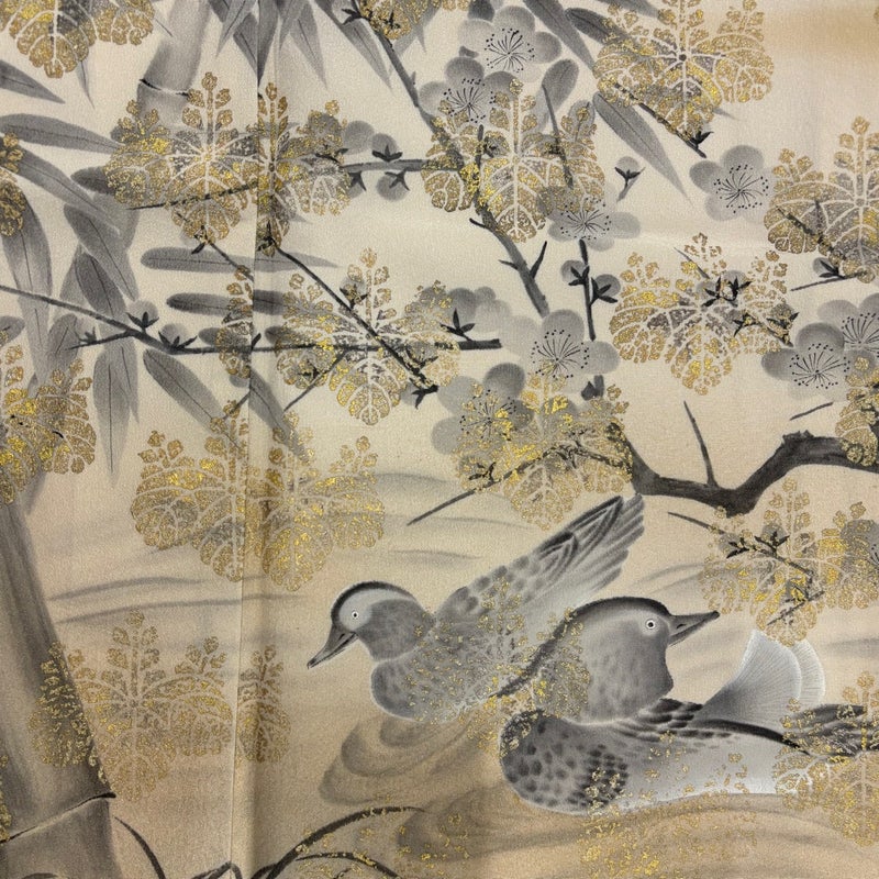 【着物ランク】秀品 【素材】正絹 【身丈】約165cm 【裄丈】約66cm 【袖丈】約43.5cm 【袖幅】約34cm 【前幅】約25.5cm 【後幅】約31.5cm 【サイズ】M 【着物仕立て】袷 【着用時期】10~5月 【状態ランク】ランクB 【着物着用シーン】披露宴出席、式典、パーティー、格式ある茶会