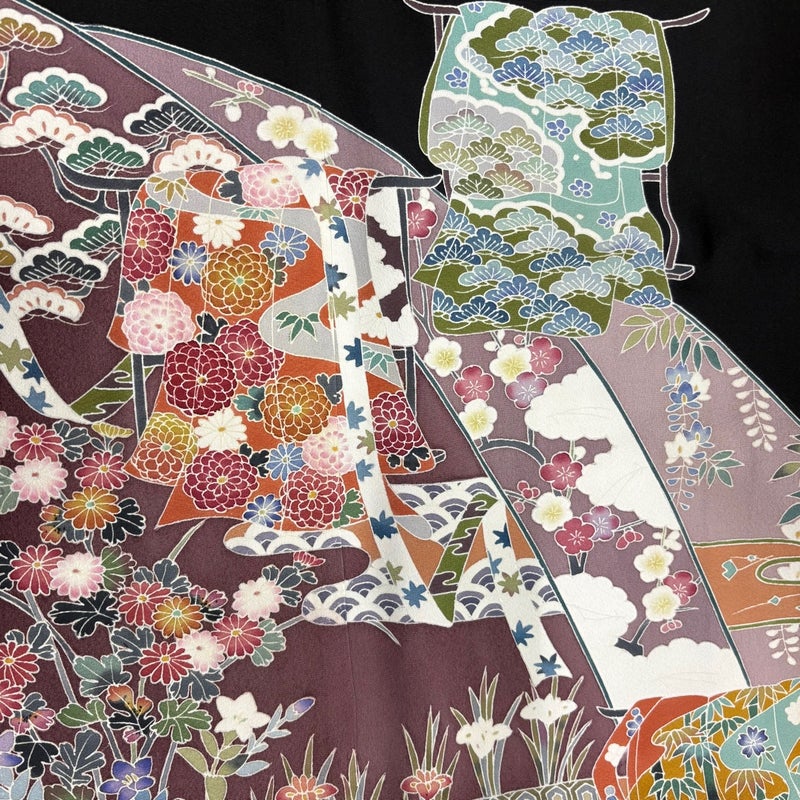 加賀友禅作家である百貫達雄の作品です。 結婚式や披露宴などで親族の第一礼装として用いられる黒留袖でございます。 既婚女性が着用する着物で、最も格の高い礼装でございます。 ※身丈・裄丈の縫込みの長さは測っておりません。 表地所々にヤケ、上前所々と下前に薄いシミ、衿周りや両袖口中に薄汚れ、右衿にシワがございます。 八掛所々にヤケ、八掛に薄いシミがございます。 リユース品としては良い状態で、まだまだご活用頂けると思われます。 ※なお、厳しく商品の状態確認を行っておりますが、記載の汚れ以外にも見落とし箇所がある可能性がある旨ご了承いただけますと幸いです。 沢山の商品の中からご覧いただき誠にありがとうございます。