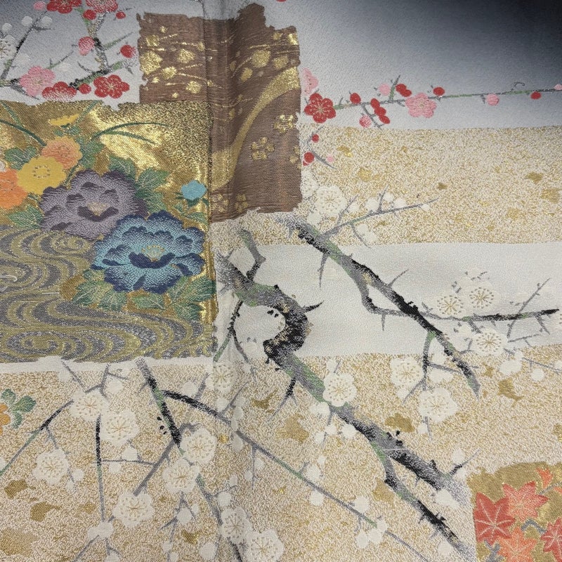 【着物ランク】秀品 【素材】正絹 【身丈】約160.5cm 【裄丈】約63.5cm 【袖丈】約49cm 【袖幅】約33cm 【前幅】約26cm 【後幅】約30.5cm 【サイズ】S 【着物仕立て】袷 【着用時期】10~5月 【状態ランク】ランクB 【着物着用シーン】披露宴の母親/仲人夫人