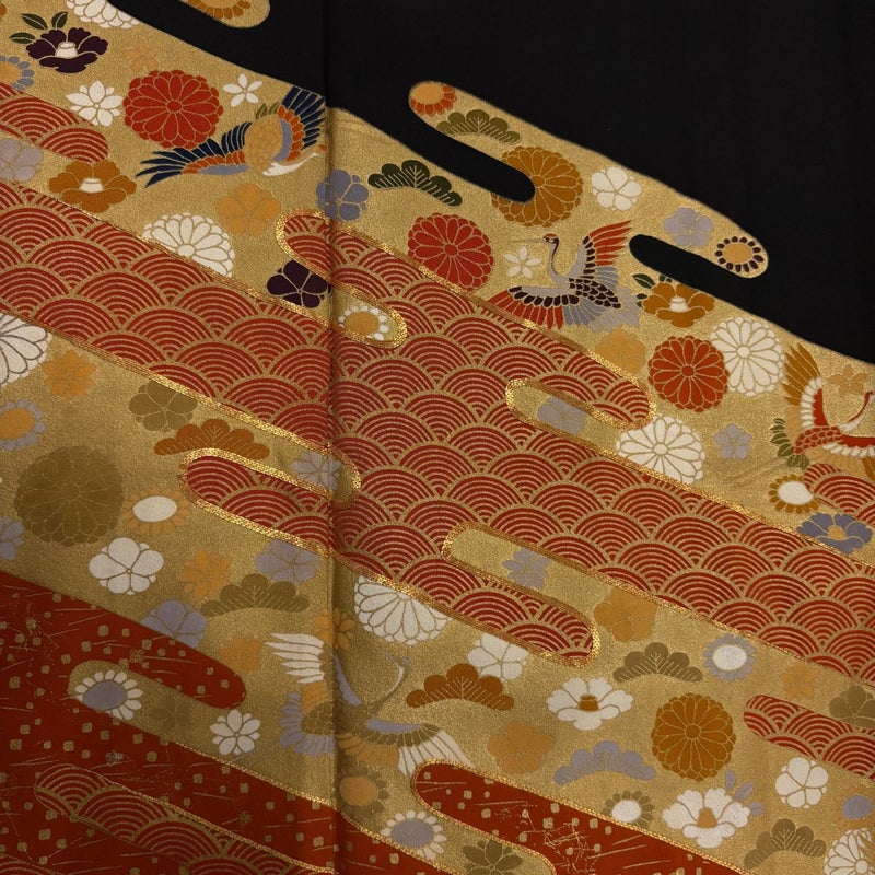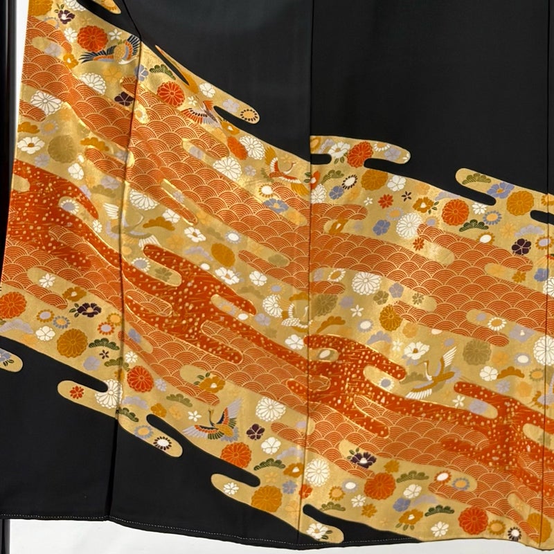 結婚式や披露宴などで親族の第一礼装として用いられる黒留袖でございます。 既婚女性が着用する着物で、最も格の高い礼装でございます。 ※身丈・裄丈の縫込みの長さは測っておりません。 表地所々にヤケ、後身頃と右胸に薄いシミ、衿周りや両袖口中に汚れがございます。 胴裏にシミ、裏地両脇に汗シミ、比翼の衿周りに汚れ、裏地所々にシワがございます。 リユース品としては良い状態で、まだまだご活用頂けると思われます。 ※なお、厳しく商品の状態確認を行っておりますが、記載の汚れ以外にも見落とし箇所がある可能性がある旨ご了承いただけますと幸いです。 沢山の商品の中からご覧いただき誠にありがとうございます。