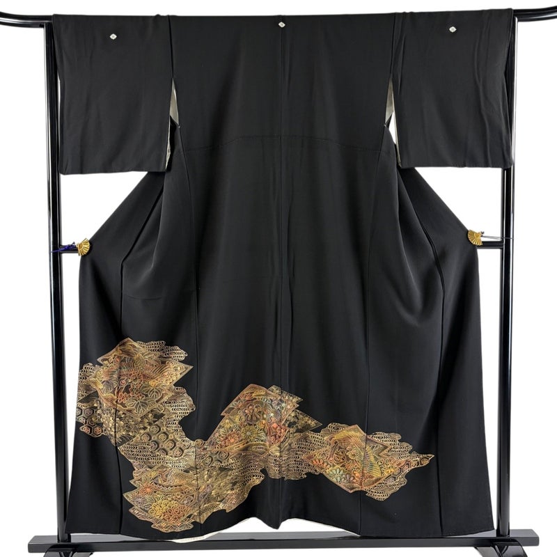 結婚式や披露宴などで親族の第一礼装として用いられる黒留袖でございます。 既婚女性が着用する着物で、最も格の高い礼装でございます。 ※身丈・裄丈の縫込みの長さは測っておりません。 表地所々にヤケ、衿周りや両袖口中に汚れ、表地所々にシワ、表地所々にほこりの付着がございます。 リユース品としては良い状態で、まだまだご活用頂けると思われます。 ※なお、厳しく商品の状態確認を行っておりますが、記載の汚れ以外にも見落とし箇所がある可能性がある旨ご了承いただけますと幸いです。 沢山の商品の中からご覧いただき誠にありがとうございます。