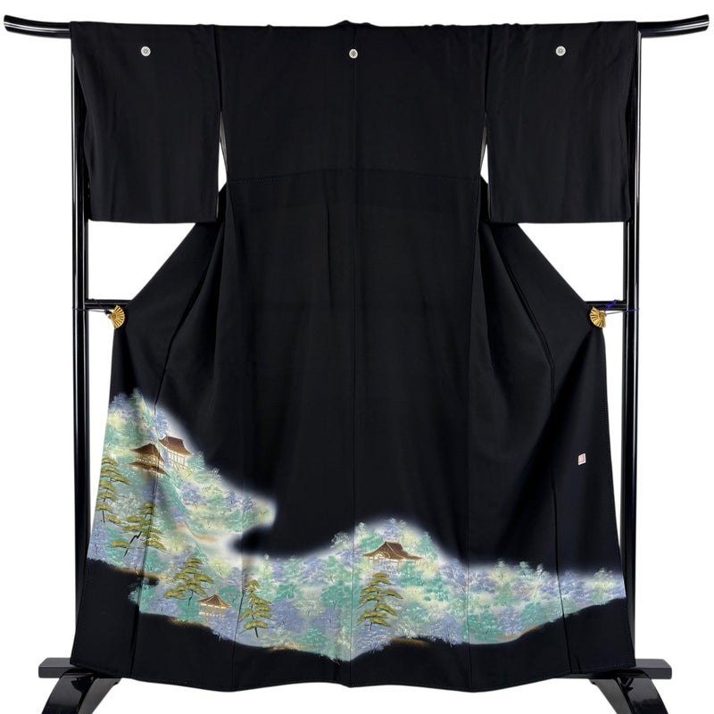 結婚式や披露宴などで親族の第一礼装として用いられる黒留袖でございます。 既婚女性が着用する着物で、最も格の高い礼装でございます。 ※身丈・裄丈の縫込みの長さは測っておりません。 衿周りと比翼の両袖口中に薄汚れ、後身頃にシワがございます。 比翼に薄いシミがございます。 リユース品としては目立った染み傷なく、状態の良いお品でございます。 ※なお、厳しく商品の状態確認を行っておりますが、記載の汚れ以外にも見落とし箇所がある可能性がある旨ご了承いただけますと幸いです。 沢山の商品の中からご覧いただき誠にありがとうございます。
