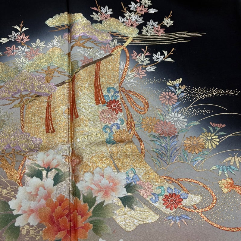 結婚式や披露宴などで親族の第一礼装として用いられる黒留袖でございます。 既婚女性が着用する着物で、最も格の高い礼装でございます。 ※身丈・裄丈の縫込みの長さは測っておりません。 表地所々にヤケ、左胸に薄いシミ、表地所々に金銀彩の変色がございます。 八掛所々にヤケ、比翼所々にシミがございます。 ご購入の際はその点ご留意ください。 ※なお、厳しく商品の状態確認を行っておりますが、記載の汚れ以外にも見落とし箇所がある可能性がある旨ご了承いただけますと幸いです。 沢山の商品の中からご覧いただき誠にありがとうございます。