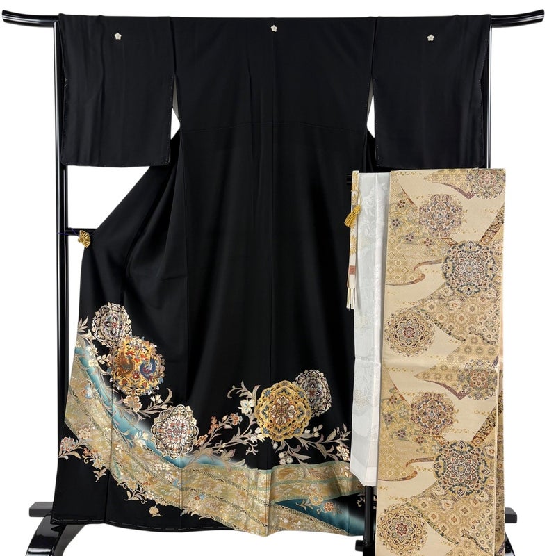 結婚式や披露宴などで親族の第一礼装として用いられる黒留袖でございます。 既婚女性が着用する着物で、最も格の高い礼装でございます。 ※身丈・裄丈の縫込みの長さは測っておりません。 表地所々に薄ヤケ、表地所々にシワ、表地所々に金彩の変色がございます。 リユース品としては良い状態で、まだまだご活用頂けると思われます。 ※なお、厳しく商品の状態確認を行っておりますが、記載の汚れ以外にも見落とし箇所がある可能性がある旨ご了承いただけますと幸いです。 沢山の商品の中からご覧いただき誠にありがとうございます。