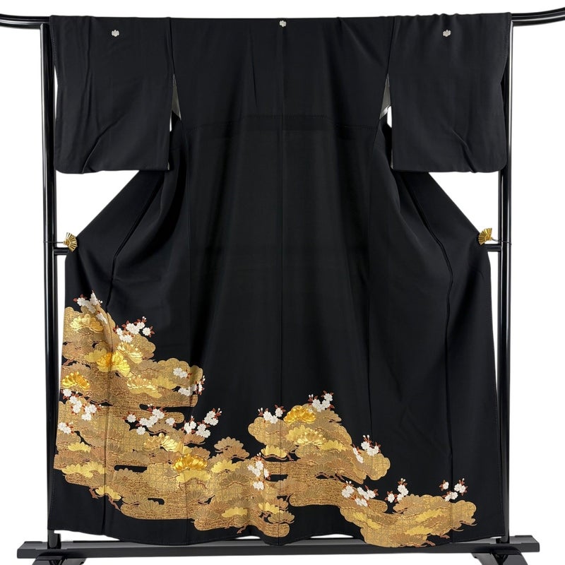 結婚式や披露宴などで親族の第一礼装として用いられる黒留袖でございます。 既婚女性が着用する着物で、最も格の高い礼装でございます。 ※身丈・裄丈の縫込みの長さは測っておりません。 表地所々にヤケ、左衿にシミ、下前の裾付近に小さなシミ、後身頃の背中付近に薄いシミ、衿周りや両袖口中に汚れ、表地所々にシワ、上前に金彩の変色がございます。 衿裏と比翼の衿にホックシミ、裏地両脇に汗シミがございます。 リユース品としては良い状態で、まだまだご活用頂けると思われます。 ※なお、厳しく商品の状態確認を行っておりますが、記載の汚れ以外にも見落とし箇所がある可能性がある旨ご了承いただけますと幸いです。 沢山の商品の中からご覧いただき誠にありがとうございます。