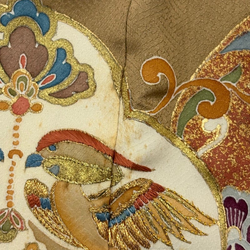 既婚、未婚問わず着用できる色留袖でございます。 汎用性が高いお着物となっておりますので、この機会にぜひいかがでしょうか。 ※身丈・裄丈の縫込みの長さは測っておりません。一つ紋の染め抜き紋です。 上前と後身頃にシミ、表地所々に小さなシミ、衿周りや両袖口中に薄汚れ、表地所々にシワ、表地所々に金彩の変色、表地所々に金糸の変色がございます。 胴裏所々と比翼と比翼の衿にシミ、八掛所々に金彩の変色がございます。 リユース品としては良い状態で、まだまだご活用頂けると思われます。 ※なお、厳しく商品の状態確認を行っておりますが、記載の汚れ以外にも見落とし箇所がある可能性がある旨ご了承いただけますと幸いです。 沢山の商品の中からご覧いただき誠にありがとうございます。